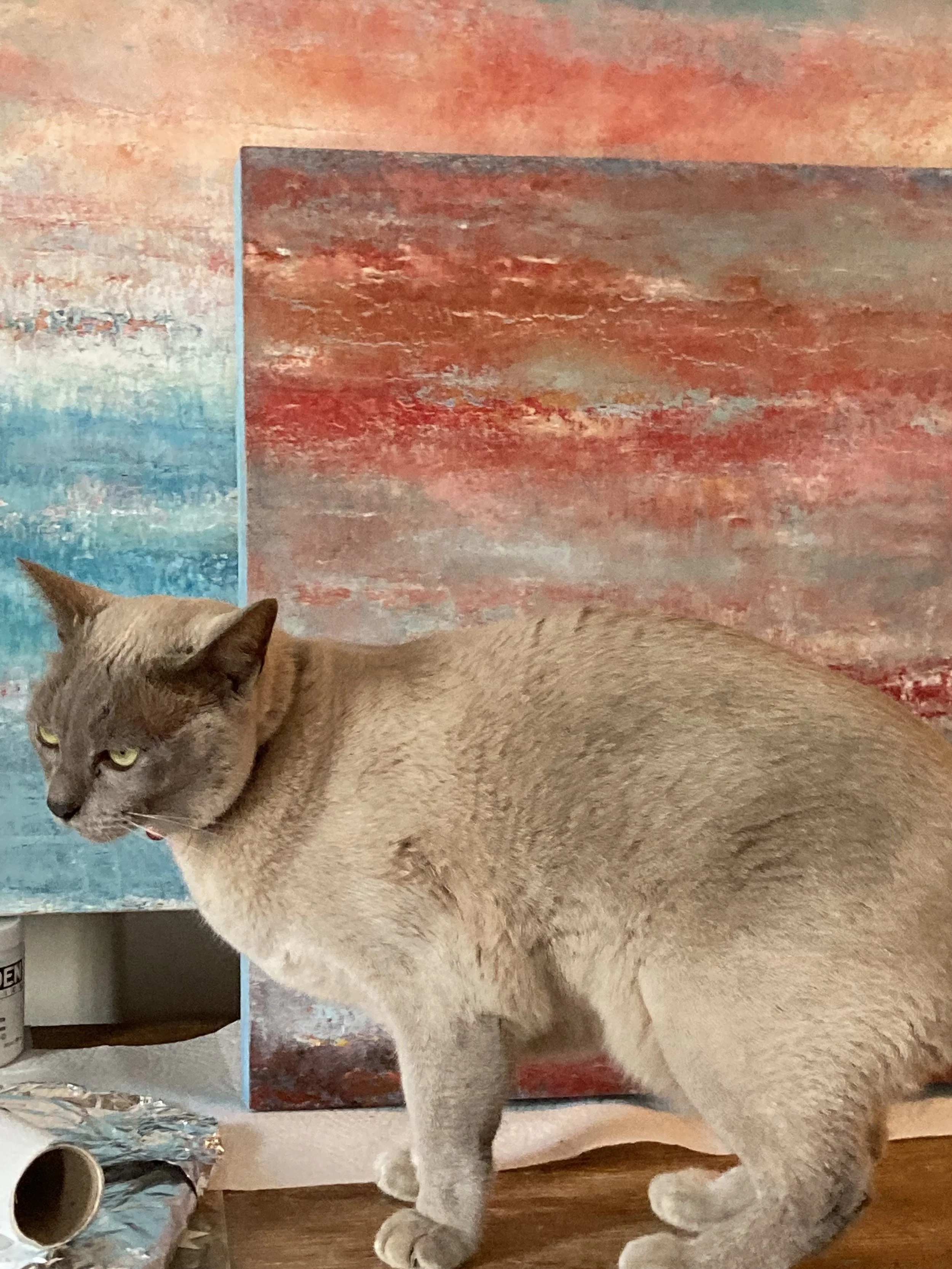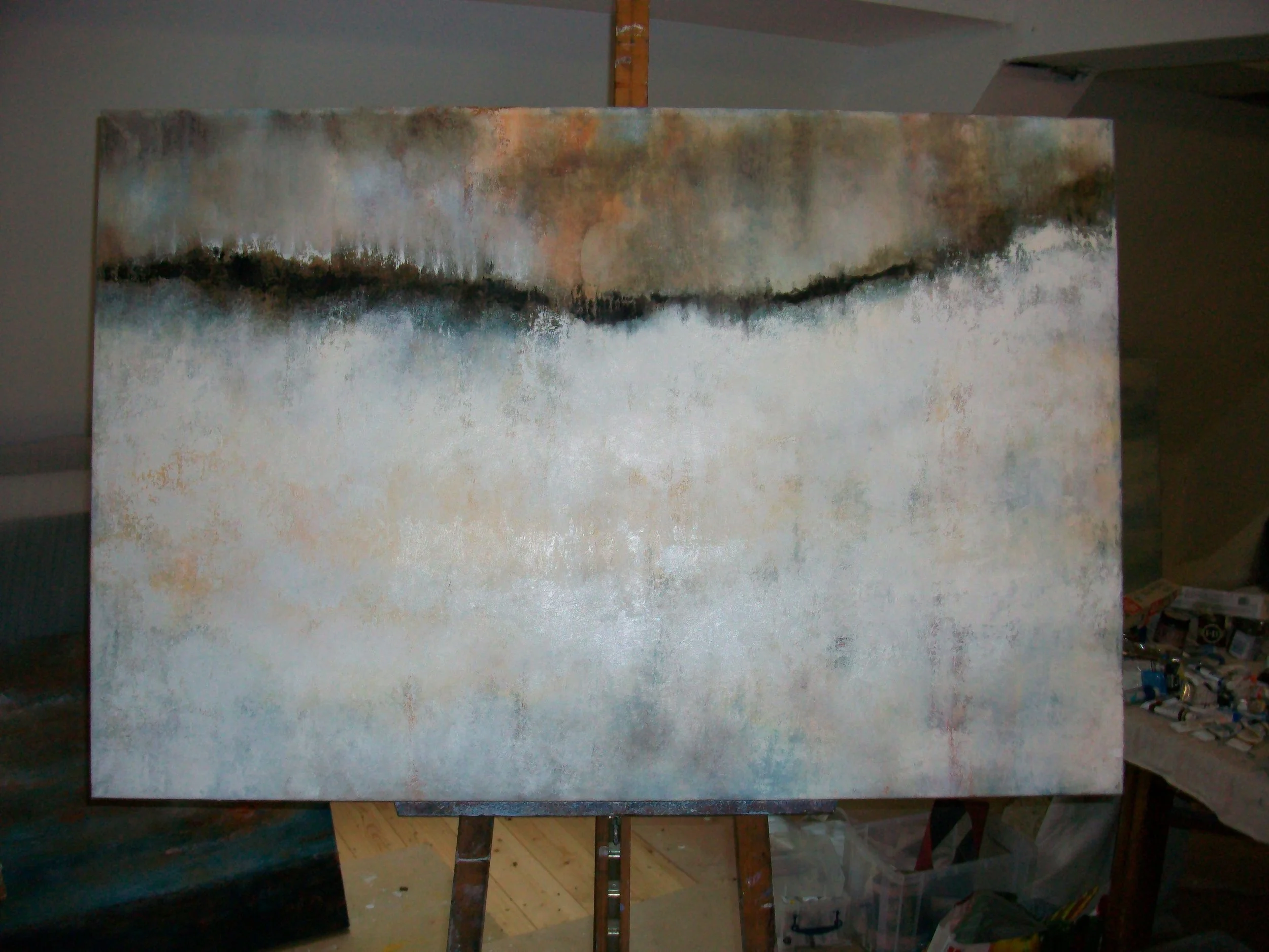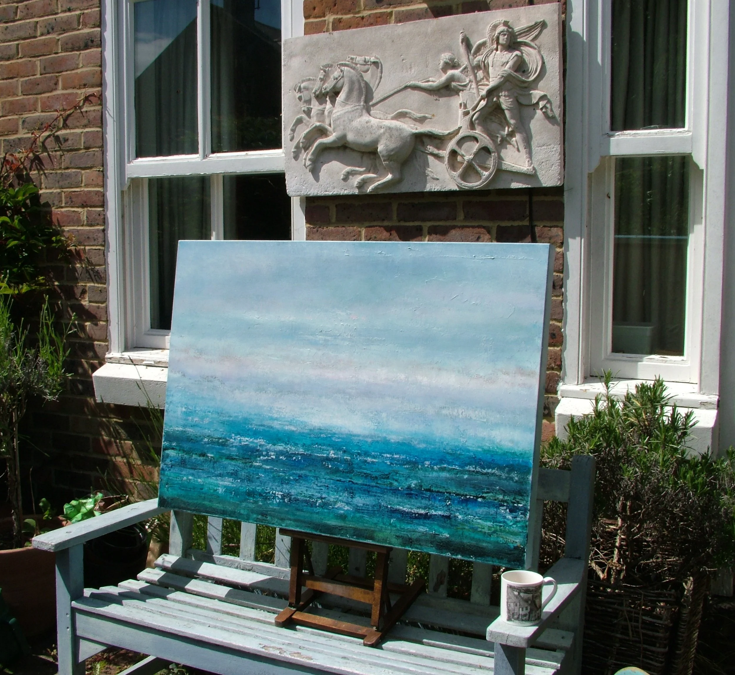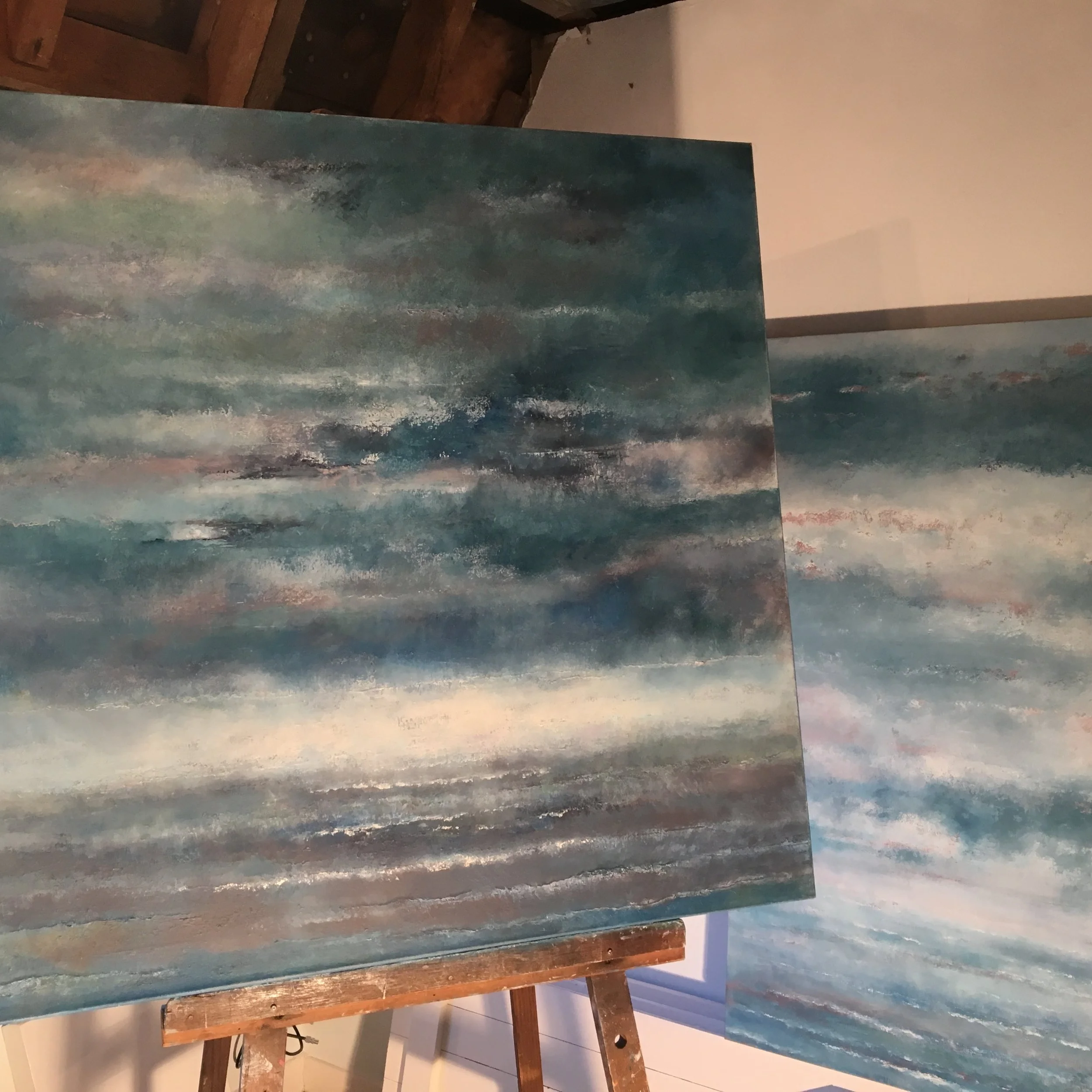 A selection of paintings showing work in progress and pieces nearly resolved. Building layers of oil takes time and it’s exciting to see where the layers take me. This process allows for planned under-painting to be seen in some parts of the canvas and gives a depth to the resulting views of seas and skies.